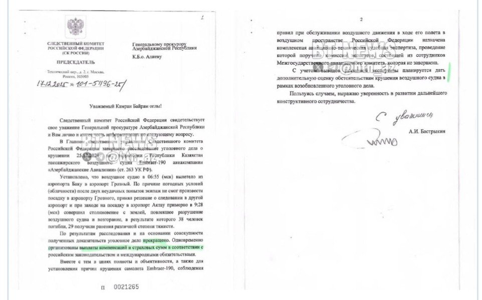 O bildirib ki, sənəd Rusiya Federasiyasının İstintaq Komitəsindən Azərbaycan Baş Prokurorluğuna ünvanlanıb: